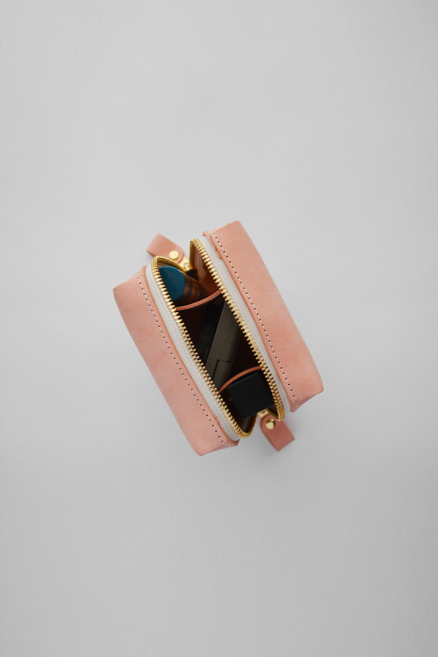 本革を使用した正方形のポーチ。一枚の革をふっくら四角い形に仕立てたポーチ。